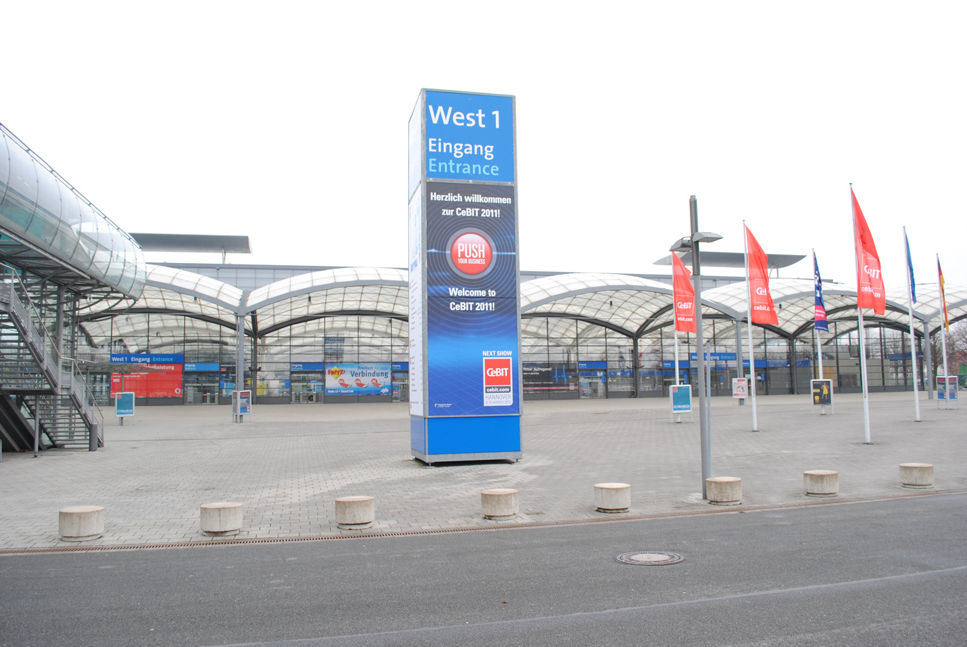 Дойдя до выставочного центра я обнаружил массу флагов с логотипом CeBIT чему был очень рад, ведь могло оказаться что гостиница и выставочный центр разбросаны по разным концам города. А тут всего 15-20 минут ходьбы прогулочным шагом, или того меньше на метро (кстати владельцы билетов на Cebit могут в дни выставки бесплатно передвигаться на автобусах, трамваях и поездах местного значения). Осмотрев все снаружи я понял, что делать там особо нечего и решил направиться погулять в центр города